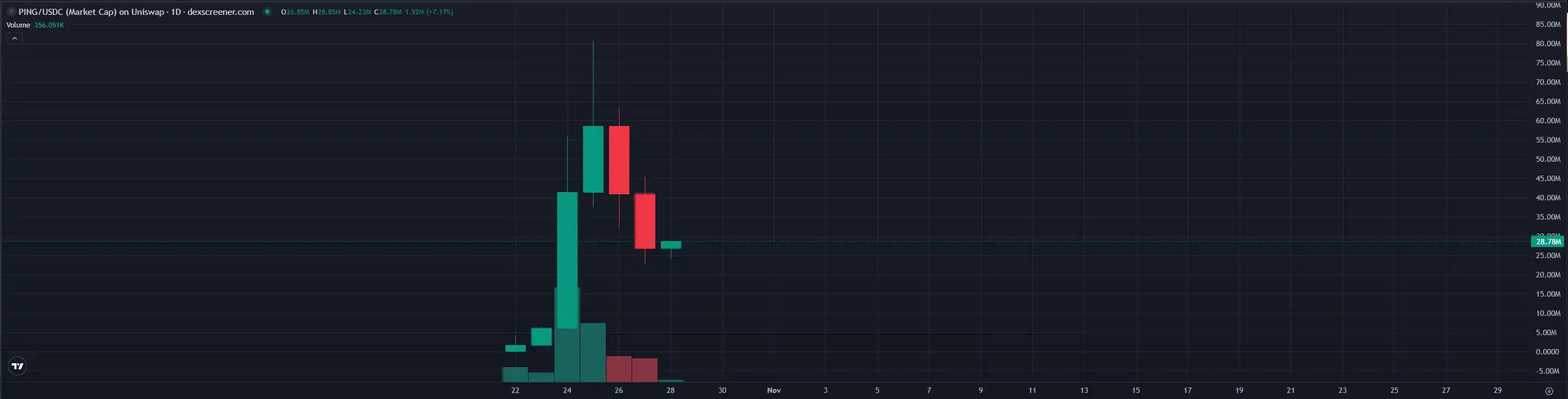 As the first meme coin born out of the x402 Protocol, $PING was once compared by many players to the first token of the BRC-20 Protocol, $ORDI, during the most FOMO stage. However, after $PING briefly surpassed an $80 million market cap, it was unable to continue its rapid ascent and has now retraced to a market cap of around $29 million.