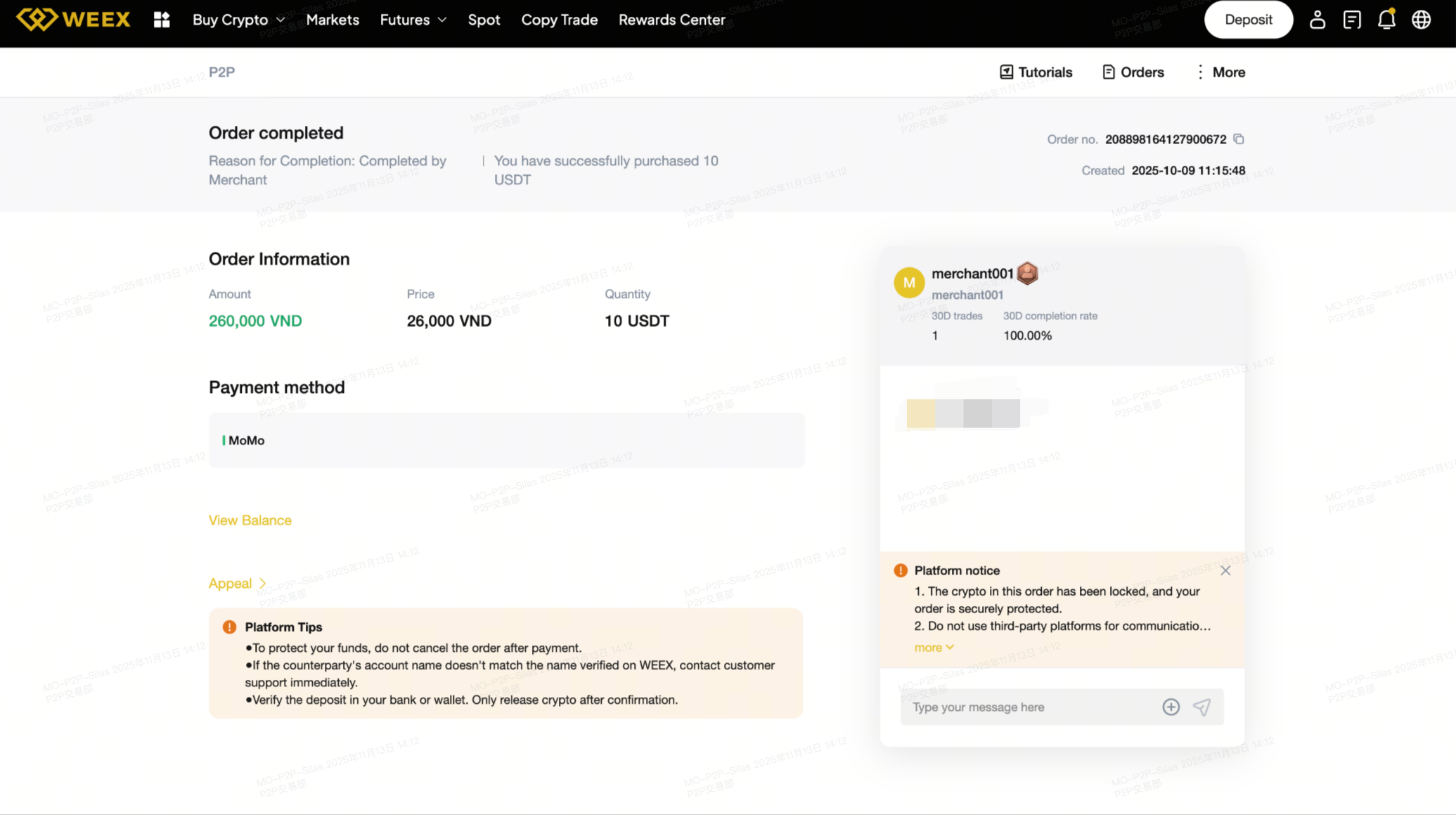 Użytkownicy są odpowiedzialni za korzystanie z usługi WEEX P2P. WEEX działa wyłącznie jako platforma pośrednicząca i nie ponosi odpowiedzialności za jakiekolwiek spory lub straty między kupującymi i sprzedającymi. Po potwierdzeniu płatności transakcja jest uważana za ostateczną. Rola WEEX ogranicza się do przeglądu dowodów i pośrednictwa w sporach w razie potrzeby.