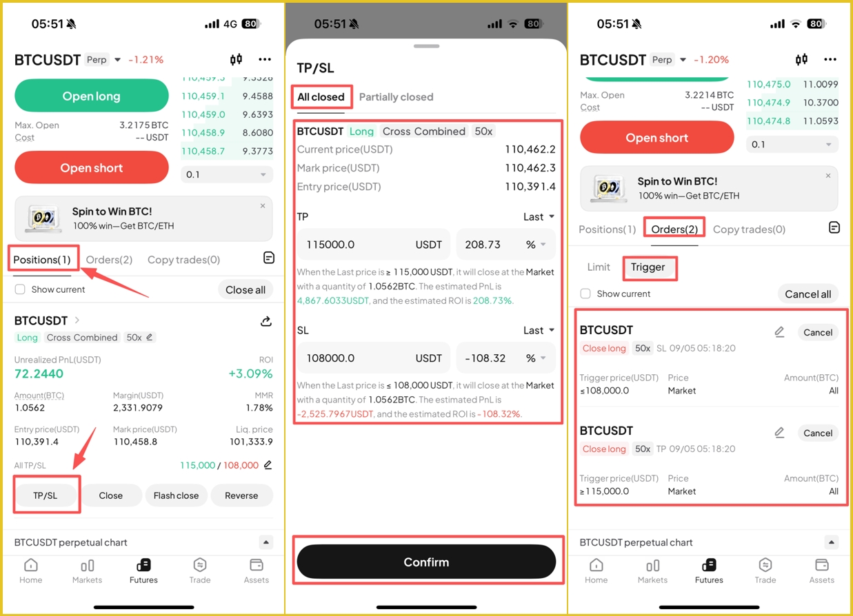 3. Após configurar o lucro/stop loss para toda a posição, os usuários podem encontrar as ordens correspondentes de lucro/stop loss na seção Trigger da interface de Ordens. Quando o preço do ativo atinge o preço de ordem especificado, o sistema executará automaticamente uma ordem de mercado para fechar toda a posição.