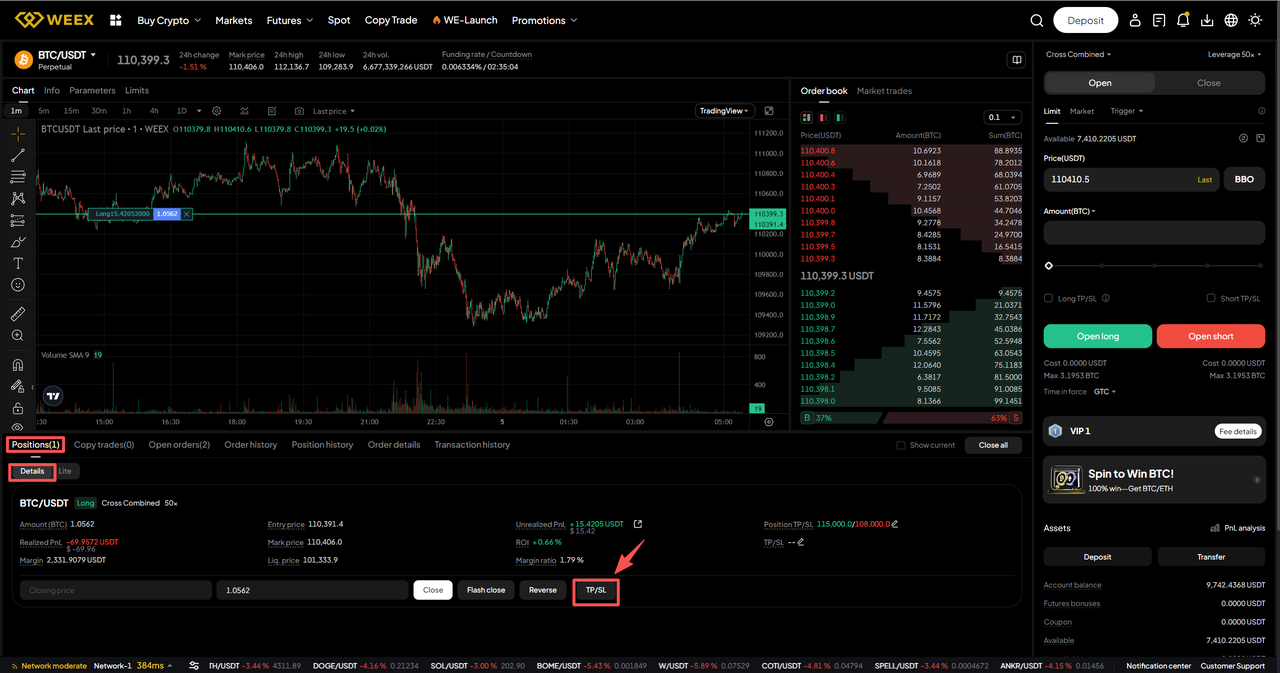 1. Após abrir uma ordem de negociação de futuros, os usuários podem encontrar o botão "TP/SL" na seção Detalhes da interface de Posições