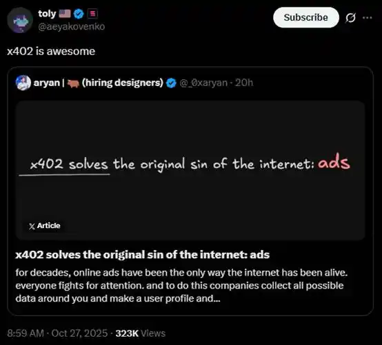 昨天,Solana 创始人 toly 发表推文表示,「x402 很酷」。