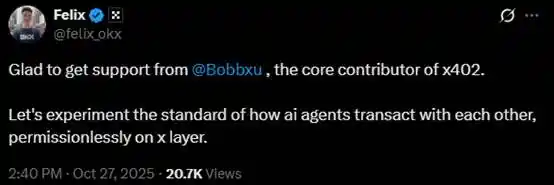 OKX Web3 钱包移动端负责人 Felix Fan 于昨天发推文表示得到了来自 x402 协议核心贡献者 Bob Xu 的支持,将一同探索在 X Layer 上实现 AI Agent 间的无许可交易: