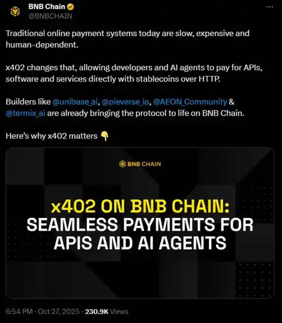 BNB 链官推同样在昨天发推宣传了 BNB 链上的 4 个 x402 协议相关项目,分别是 Unibase、pieverse、AEON.xyz 以及 TermiX AI。